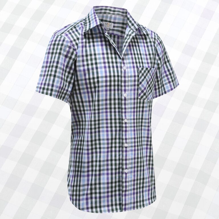 Heren overhemd korte mouw, paarse en groene ruit, met magneetsluiting